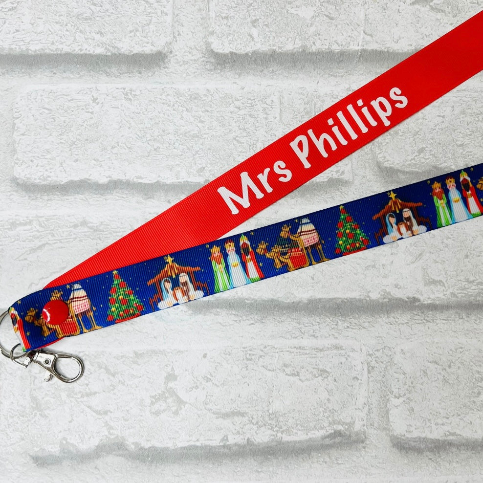 Handmade personalised christmas nativity lanyard, contrast colour will be red with white personalisation