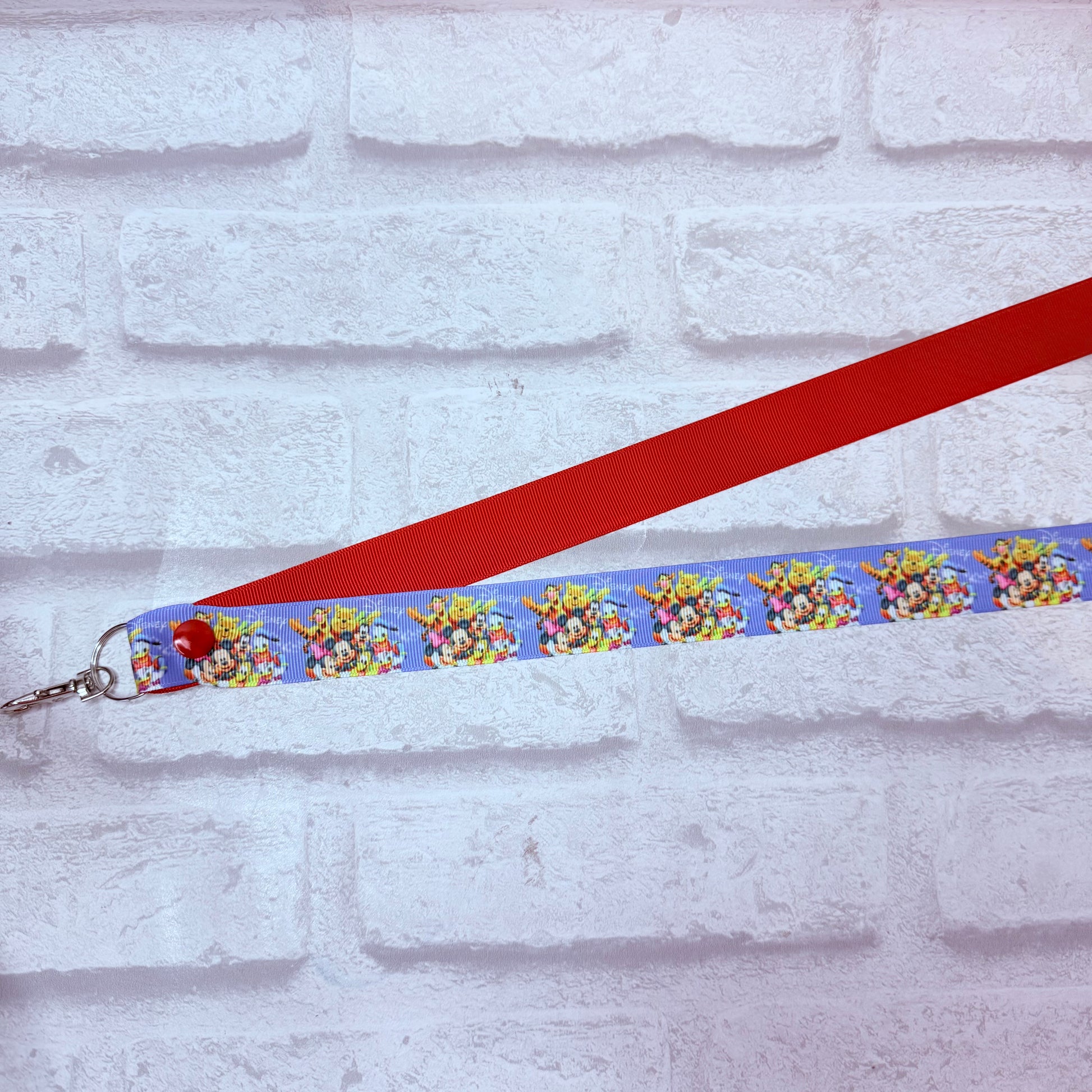 Handmade personalised disney friends print lanyard, contrast colour red with white personalisation
