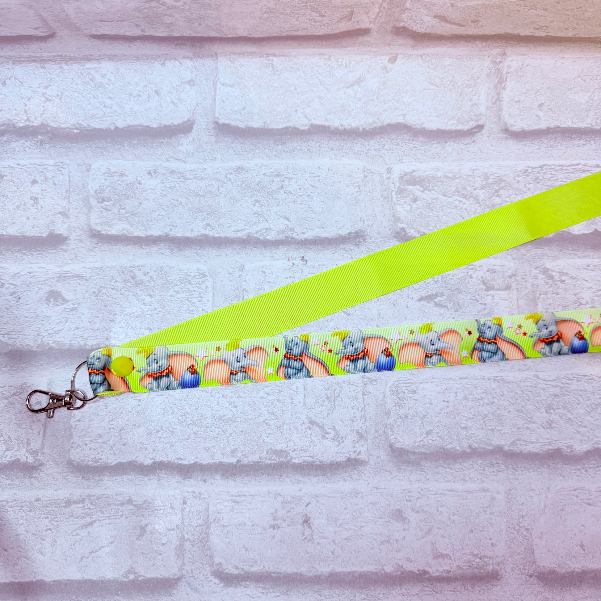 Handmade personalised dumbo print lanyard, contrast colour lemon with silver personalisation