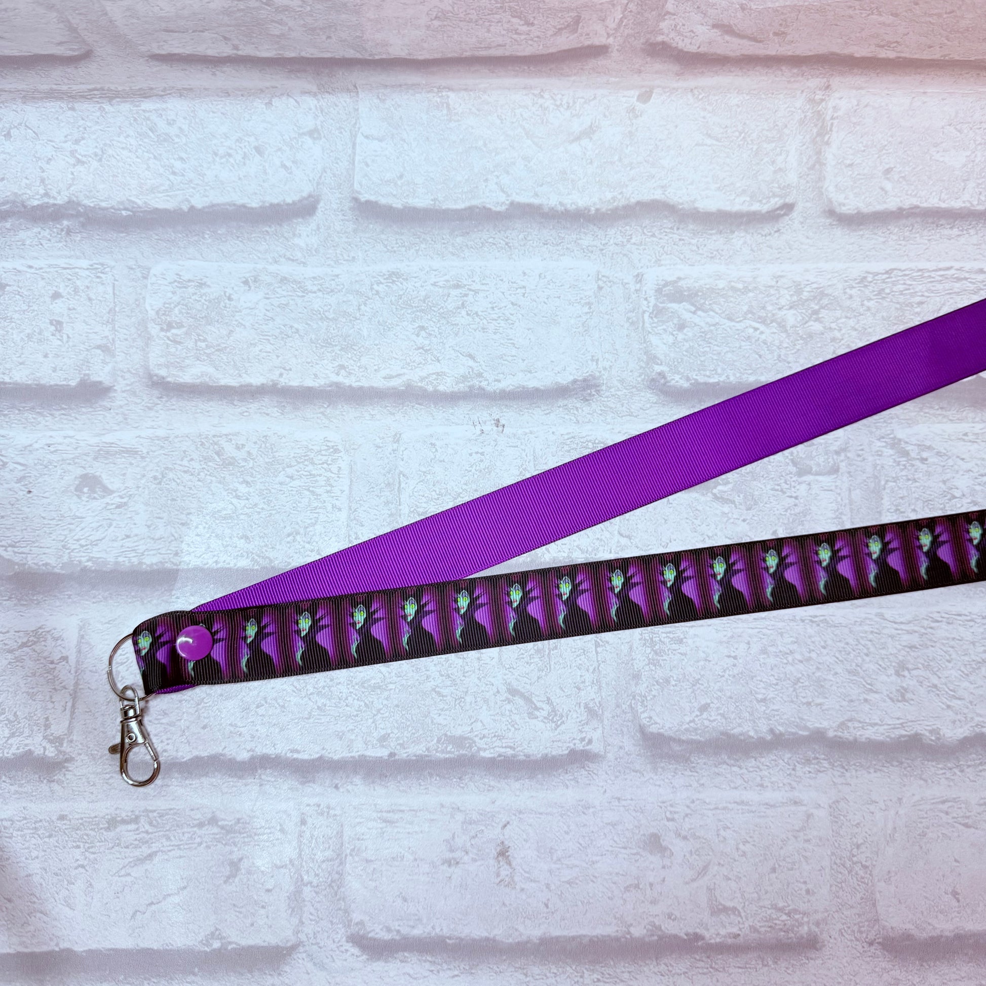 Handmade personalised maleficent print lanyard, contrast colour purple with white personalisation