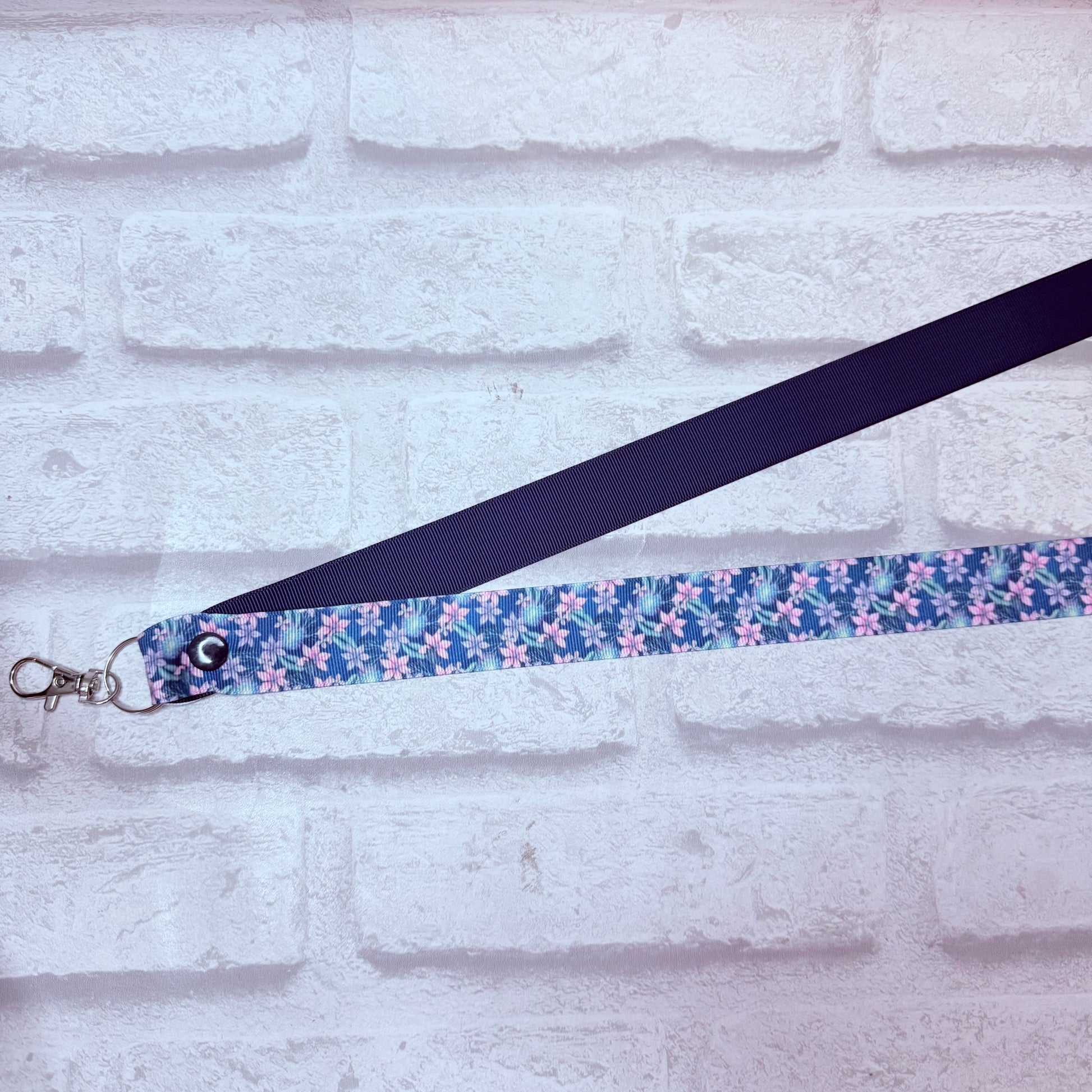 Handmade personalised navy floral print lanyard, contrast colour navy with white personalisation