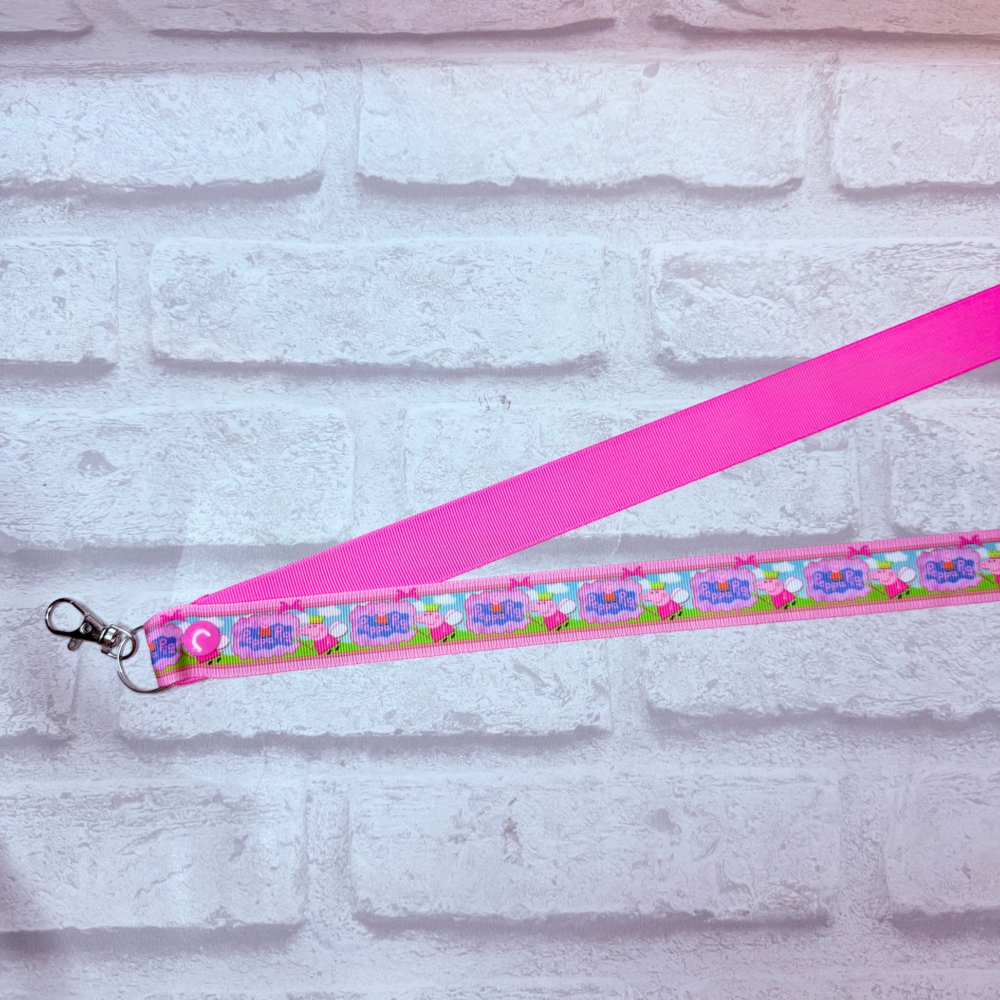 Handmade personalised peppa print lanyard, contrast colour pink with white personalisation