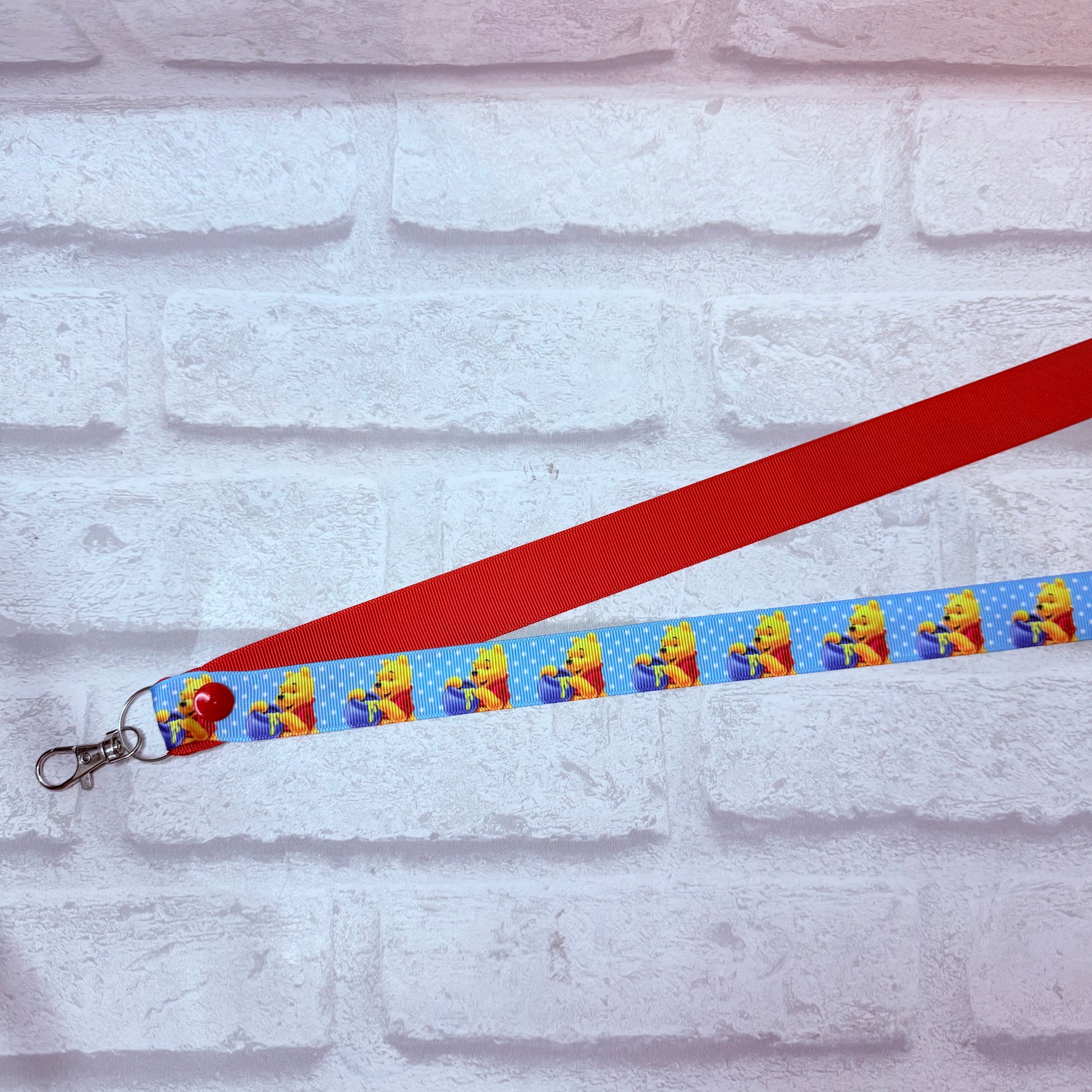 Handmade personalised winnie print lanyard, contrast colour red with white personalisation